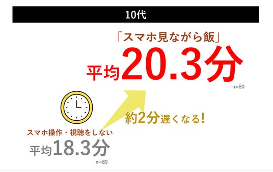 スマホの操作・視聴を一切していない時の食事の平均時間と、「スマホ見ながら飯」の平均時間で、最も回答の多かった時間を比較した結果、10~20代は「スマホ見ながら飯」で食事スピードが遅くなることが明らかになりました。スマホの操作・視聴を一切していない時は10代が平均18.3分、20代が15.5分だったのに対して、「スマホ見ながら飯」では10代が20.3分、20代が20.6分となり、スマホの操作・視聴を一切していない食事よりも、「スマホ見ながら飯」の方が10代では約2分、20代では約5分長くなっていることが明らかになりました。