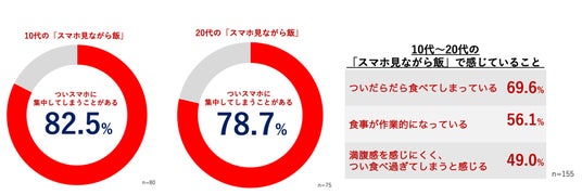 「スマホ見ながら飯」をしている際に「ついスマホの操作、視聴に集中してしまうことがあると感じる」と回答した人は10代で82.5%、20代で78.7%となりました。10代~20代に「スマホ見ながら飯」をしている際に他に感じていることを聞くと69.6%が「ついだらだら食べてしまっている」、56.1%が「食事が作業的になっていると感じる」、49.0%が「満腹感を感じにくく、つい食べ過ぎてしまう」と集中できていない理由が分かれる結果となりました。「スマホ見ながら飯」をするとついスマホの方に意識が向いてしまい、食事に集中できていないのかもしれません。