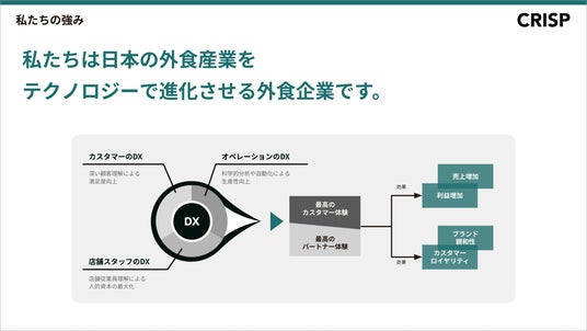 また、次のフェーズとして私たち独自のDX手法「クリスプメソッド」をM&Aした飲食ブランドにも導入しさらなる成長を実現すると同時に、外食産業全体の変革に挑戦します。