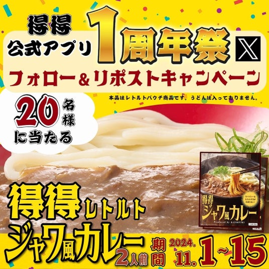 11月で得得公式アプリがリリースより1周年を迎えることができました。これも得得を愛してくれているお客様のおかげです。得得公式アプリ1周年を記念して、2024年11月1日(金)~11月15日(金)の期間に得得公式Xアカウントで得得オリジナルのレトルトカレー「得得ジャワ風カレー」(2人前)を20名様にプレゼントする「得得公式Xフォロー&リポストキャンペーン」を実施します。得得の公式Xアカウントをフォローし、キャンペーンポストをリポストすることで参加でき、本格的なスパイシーな辛さも楽しめる得得オリジナルのレトルトカレー「得得ジャワ風カレー」(2人前)が当たります。ぜひこの機会に得得公式Xフォロー&リポストしてご応募ください。