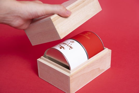 紅白のパッケージを桐箱に詰めて