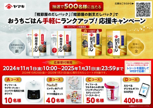 ヤマキ株式会社(本社:愛媛県伊予市 代表取締役社長:城戸善浩 以下ヤマキ)は、『鰹節屋のだしパック』シリーズを対象とした「おうちごはん手軽にランクアップ!応援キャンペーン」を2024年11月1日(金)より開催します。ご応募いただいた方から抽選で合計500名様に豪華家電商品・にゃでぃあグッズ(※)&ヤマキ人気商品やキッチン用品のほか、デジタルギフトが当たります。