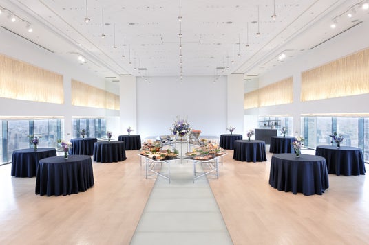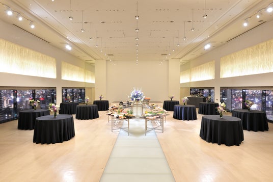 両サイドがガラス張りの造りが他には見られないバンケットです。ホテル最上階、地上105mからの眺めが集まる方々の記憶に残る、開放的な空間。プロジェクタースクリーンが3面あり、会場全体で一体感のある演出が可能です。最大収容人数200名(着席の場合)。
