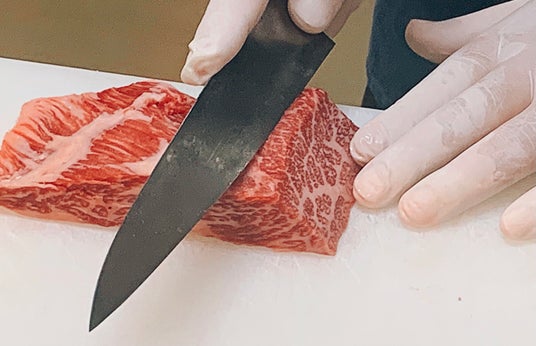 お肉もお魚も同様、切りたてが一番おいしいものです。切る技術に関しては、創業100年になる来民屋の肉職人の技術を継承し、店舗で切りたてのお肉をご提供しております。お肉を手切りすることにより肉の繊維を活かし厚さや形状を調整して一番美味しく食べれるようにしております。