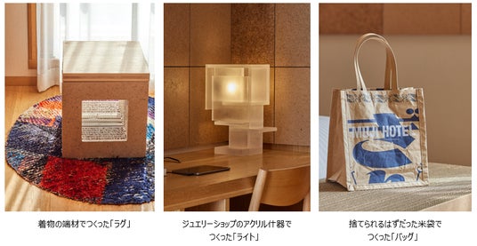 また、今回の取り組みでは銀座の街から生まれた端材を活用し、オリジナルアップサイクルを実施しました。宿泊者限定のアメニティとして、銀座米卸問屋の捨てられるはずだった米袋でつくったオリジナルバッグをご用意したほか、インテリアには、銀座老舗呉服店の着物の端材でつくったラグや、ジュエリーショップのアクリル什器で作ったライトが室内に彩りを添えています。