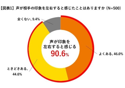 声の印象に関して、声が相手の印象を左右すると感じたことが「よくある・ときどきある」と全体の90.6%、約9割の人が、声が相手の印象を左右すると感じていることが判明【図表1】。