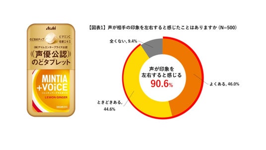 アサヒグループ食品株式会社(本社 東京、社長 川原浩)は、いい声をサポートする『ミンティア+VOiCE レモンジンジャー』より、ビジネスパーソン500名を対象に、声に関する意識調査を実施。調査の結果、声が相手の印象を左右すると90.6%の人が感じていることが判明し、86.2%の人が声はビジネススキルに含まれると回答しました。この結果について、ビジネスボイストレーナーの秋竹朋子さんは「声は自分の印象を決める大事な要素であり、第一印象を決める要素としての声、つまり“ファーストボイプレッション”を意識することはビジネスパーソンには重要」と解説しました。