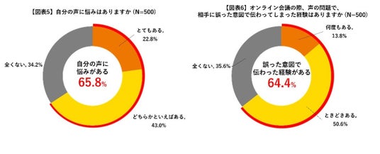 また、自分の声の悩みに関しては、悩みが「とてもある・どちらかといえばある」と65.8%が回答【図表5】。「オンライン会議の際、声の問題で、相手に誤った意図で伝わってしまった経験はありますか」という質問では、「何度もある・ときどきある」と64.4%が回答し、オンライン会議でも多くの人が声に悩みを抱えていることがわかりました【図表6】。