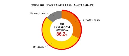 続いて、声はビジネススキルに含まれるかという質問では、86.2%の人が「とても思う・思う」と回答し、声の印象がビジネスシーンにおいても重視されていることが示唆される結果となりました【図表3】。