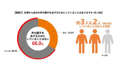 声の対策に関して、「日頃から自分の声の調子をあげるためにしていることはありますか」という質問では、66.0%が「いいえ」と回答し、約3人に2人は何もしていないことが明らかに【図表7】。