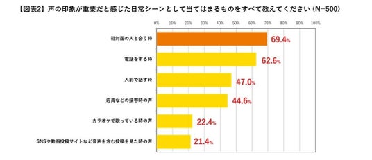 また、声の印象が重要な日常シーンとして、「初対面の人と会う時」が69.4%と最も高く、次いで「電話をする時」62.6%、「人前で話す時」47.0%という結果になりました【図表2】。