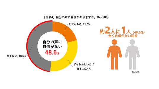 自身の声に関して、「自分の声に自信がありますか」という質問では、「全くない」と48.6%が回答し、約2人に1人は自分の声に自信がないことが判明しました【図表4】。