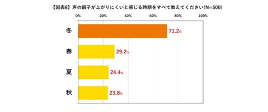 また、声の調子が上がりにくい時期については、「冬」が71.2%と最も高いことが判明し、次いで「春」29.2%、「夏」24.4%、「秋」23.8%という結果となりました【図表8】。