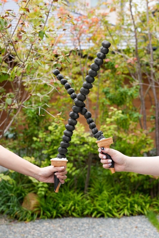 黒刀の黒色は竹炭で、竹串に20個カステラを刺し日本刀を再現。