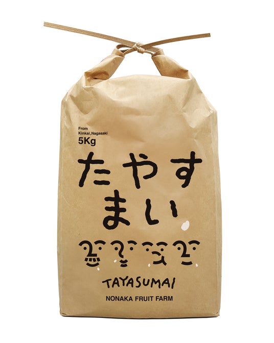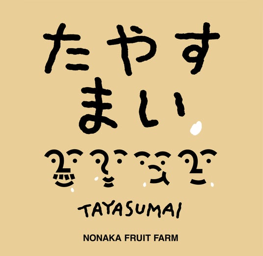 野中果樹園がある長崎市の琴海地区でも、水田の担い手不足は課題となっています。そのような状況のなかで「地域がつないできた米づくりの共有財産を絶やすまい」という想いから、野中果樹園は担い手がいない田んぼを引き継ぐことに決めました。その田んぼで初めてつくったお米を2024年11月1日から販売します。商品名は米づくりに対する想いを込めて「たやすまい」としました。デザインとイラストを手がけたのはさまざまな業界で活躍されている青木謙吾さん。パッケージにはお米を食べて満足そうな老若男女の顔(口もとについた米粒が美味しさを物語っている)が描かれています。