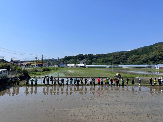 田植えの風景。横浜からきた修学旅行生が田植え体験にチャレンジ