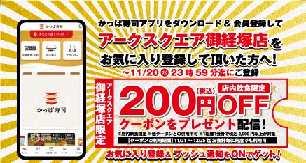 公式アプリ(https://www.kappasushi.jp/app.html)をダウンロード&会員登録いただき、11月1日(金)から11月20日(水)23時59分までに『アークスクエア御経塚店』をお気に入り登録いただくと、11月21日(木)から12月25日(水)まで、お会計毎に何度でもご利用いただける“店内飲食限定200円(税込)OFFクーポン”をプレゼント配信いたします。