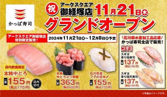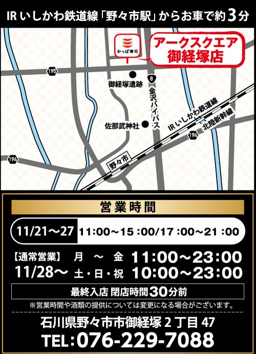 コロワイドグループのかっぱ寿司(カッパ・クリエイト(株) 本社:神奈川県横浜市、代表取締役社長:山角豪)は、2024年11月21日(木)に「かっぱ寿司 アークスクエア御経塚店」をオープンいたします。