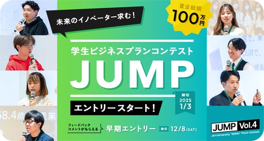 JAグループのイノベーションラボ「一般社団法人AgVenture Lab(アグベンチャーラボ)(東京都千代田区、代表理事理事長:荻野浩輝)」は「食」「農」「くらし」などの視点から社会課題の解決を目指す学生起業家を増やすことを目的とした「学生ビジネスプランコンテスト“JUMP Vol.4”」のエントリー受付を11月1日に開始しました。このコンテストは、大学の学部生、大学院生、ポストドクターらを対象とした全国規模のビジネスプランコンテストで、2021年から始まり今回で4回目となります。