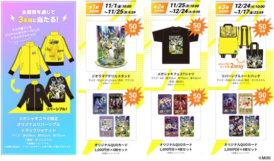 メガシャキコラボ限定のトラックジャケットやアクリルスタンドなど、抽選で豪華賞品が当たるメガシャキ購入キャンペーン(2024年11月1日(金)~2025年1月17日(金))に加え、コラボを記念したXフォロリポキャンペーン(11月1日(金)~11月15日(金))を開催いたします。