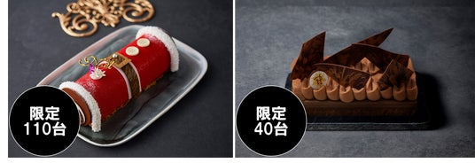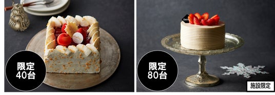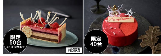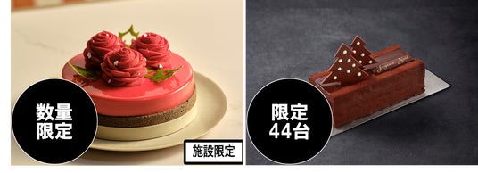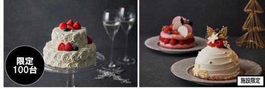雪の結晶をかたどったホワイトチョコが可憐なクリスマスケーキ(画像手前)。ルビーチョコレートのムースでフランボワーズジュレとピスタチオのムースをサンドした、「ILBrio Natale 2024」(全20台限定・画像奥)も。