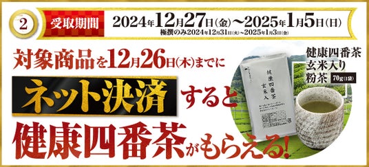 2024年12月27日(金)~2025年1月5日(日)のお受取り限定で、12月26日(木)までに対象のお持ち帰り商品をネット決済いただくと『健康四番茶』をプレゼントいたします。ネット決済していただくことで店頭での待ち時間を最小限に!ご希望のお時間にお持ち帰りいただけます。