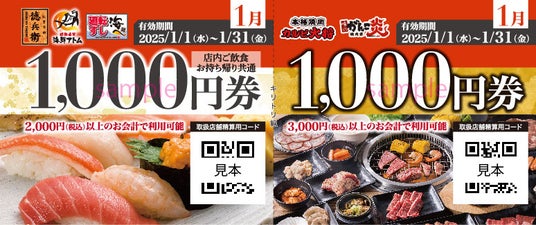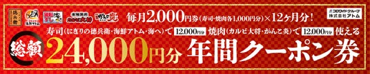 ※『年間クーポン』は、毎月2,000円分(寿司・焼肉各1,000円分)×12ヶ月分のクーポンです。寿司は2,000円以上、焼肉は3,000円以上のお会計でご利用可能です。
