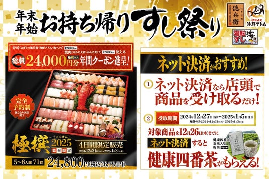 さらに年末年始限定桶「極撰2025 (ごくせん) 」を2024年12月31日(火)~2025年1月3日(金)の4日間限定で販売! 年末年始のご馳走にピッタリの5~6人前のお持ち帰り寿司で、ロブスターやあわび、本ずわい蟹、うに、いくら等の豪華な魚種が食卓を彩ります。大切なご家族・ご親戚が集うときだからこそ、にぎりの徳兵衛、海鮮アトム、海への本格寿司をぜひお楽しみ下さい。皆様のご予約を心よりお待ちしております。