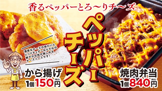 揚げたてから揚げとテリー伊藤こだわりの玉子焼き「から揚げの天才」で、2024年11月1日(金)から、「ペッパーチーズから揚げ」150円(税込)と「ペッパーチーズ焼肉弁当」840円(税込)を販売開始いたします。ひと味違う濃厚で色鮮やかなレッドチェダーソースはから揚げに相性抜群!ピリッと効かせたブラックペッパーもアクセント。冬を感じる新しいフレーバー「ペッパーチーズ」をぜひこの機会にお試しください!。