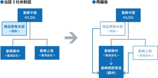 星崎中国HLDGの商品開発本部(開発機能)、星崎上海(販売機能)、星崎蘇州(製造機能)の3社に分かれている機能を、星崎蘇州を母体とする1社に経営統合し、2025年1月2日より統合会社として業務を開始します。経営統合に先立ち、10月18日に、星崎蘇州は星崎商厨智造(蘇州)有限公司 (所在地:中国江蘇省蘇州市)へ社名を変更しています。