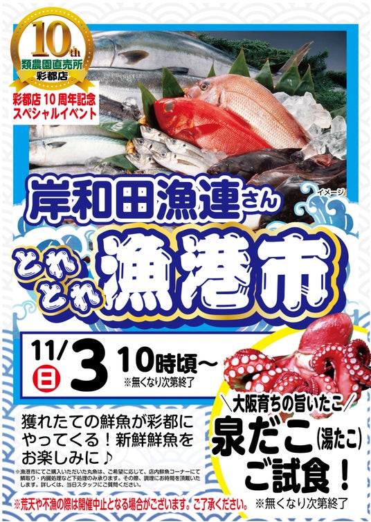 ・3日(日):岸和田漁連さんによる「とれとれ漁港市」(泉だこ<湯だこ>のご試食)