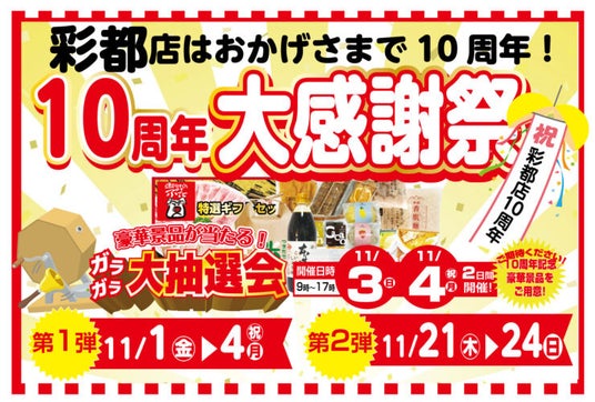 なお今年は、11月21日(木)から24日(日)に10周年大感謝祭の第2弾を予定しています。第2弾の詳細は追ってお知らせします。