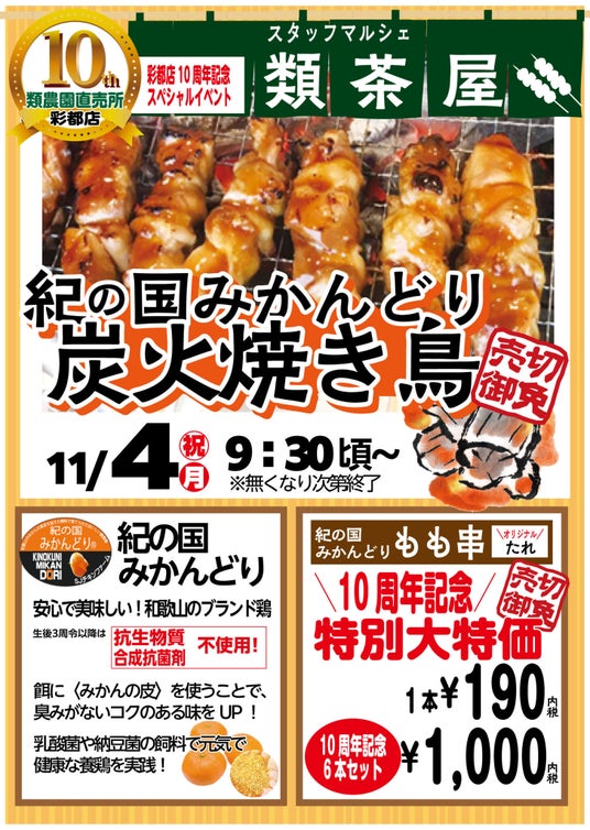 ・4日(月・祝):類茶屋「紀の国みかんどり 炭火焼き鳥」(10周年記念特別価格で販売)