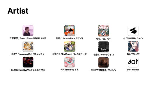出展アーティスト:HumNyaWe、Jooyeon Koh、Lindsay Park、mac(TOKYO LUV)、meme、PIE、RailGuard、Volo、Saeko Ehara、SHHAN、WONSEO、yoh murata