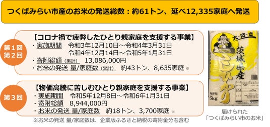 その一環として、つくばみらい市と、地方創生に資する産業復興、食料自給率維持のため、需要減少に悩む米作産業に対する支援を行うと同時に、ひとり親家庭の貧困問題についての支援事業を実施しております。