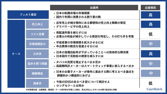 従来外資系のコンサルティングファームで出題されていたケース面接ですが、近年日系企業でも「経営者目線で事業を考えて動かせる人」が求められるようになってきた背景から、総合商社、総合デベロッパー、メーカー(マーケ職)、メガベンチャー企業等でもケース面接が導入されるようになってきました。