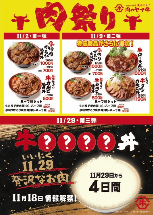 株式会社肉のヤマ牛(本社:東京都渋谷区、代表取締役社長:池ノ上 達也)が展開する、食の感動体験を追求し、切りたて・焼きたてにこだわる炭火仕上げ肉のヤマ牛は、毎月日ごろのご愛顧に感謝し肉の日“2”・“9”・“29”日に肉の日を開催しております。11月の肉の日はさらにパワーアップし、人気の看板商品である『厚切りかるび焼肉丼』『牛カルビ焼肉丼』、他『牛ロース丼』や『厚切り牛タン&カルビ丼』も感謝価格にて販売いたします。