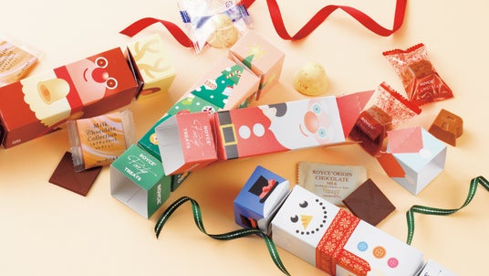 サンタやツリーなどをデザインしたカラフルな小箱の両端を引っ張り合うと、中からチョコレートが飛び出します。スティック状の小箱は小分けのプレゼントとして配るのもおすすめ。クリスマスパーティにぜひお使いください。
