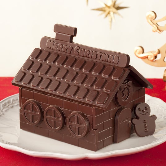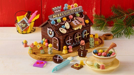 チョコレートでできたパーツを付属のペンチョコで貼り付けて組み立てると、丸ごと全部食べられるお家が完成。アイデアやセンスを生かしてデコレーションすると、世界でたったひとつのチョコレートの家に。パッケージにはかわいい妖精たちがチョコレートの家を組み立てている様子が描かれています。