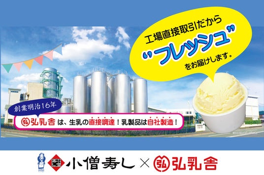 KOZOホールディングス株式会社の子会社である株式会社小僧寿しは、持ち帰りすし店「小僧寿し」にて、株式会社弘乳舎より工場直接取引の「”フレッシュ”アイスクリーム」3種(バニラ・カフェオレ・ミルク&チョコチップ) を販売開始しております。