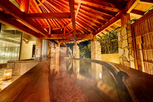 開放感にあふれた空間で温泉を楽しめる大浴場。ちょっとした贅沢感を楽しめるメニューやその土地ならではの食材を味わえるバイキング。