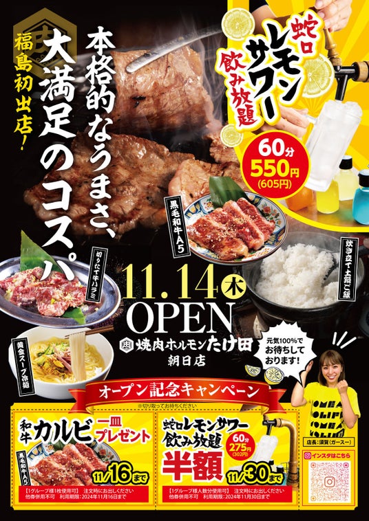 最高ランクA5黒毛和牛カルビや炊きたて土鍋ごはんなど、『日常価格でごちそう体験』をテーマとして「焼肉ホルモンたけ田」を中心に、複数の焼肉ブランドを運営する株式会社ミナモト(代表取締役:細田源太)は、『郡山 焼肉ホルモンたけ田 朝日店』を2024年11月14日にグランドオープンいたします。また、オープンに合わせて元祖名物『蛇口レモンサワー(R)』が半額(60分303円)になるキャンペーンも同時に開催いたします。