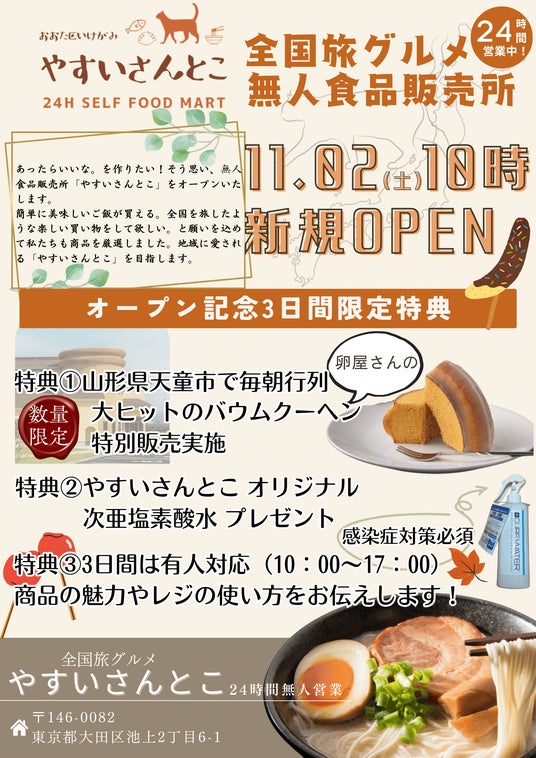 全国旅グルメ無人食品販売所「やすいさんとこ」(東京都大田区池上2-6-1)が2024年11月2日10時よりグランドオープン