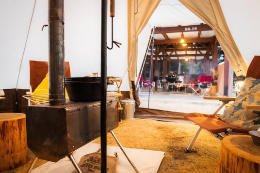 ●薪ストーブのティピーテントと、陣幕&焚き火台のあるBBQピット併設で寒さ知らず