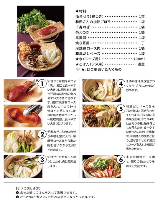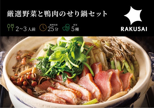 楽彩株式会社(本社:東京都足立区/代表取締役社長:大崎善保)は、11月7日「鍋の日」にあわせて2024年11月4日(月)より“厳選野菜と鴨肉のせり鍋セット”を予約発売いたしました。青果物流通業のリーディングカンパニーであるデリカフーズグループだからこそできる、「厳選野菜」がおいしい「せり鍋セット」です。まもなく立冬を迎え、いよいよ季節は秋から冬へ。鍋がおいしいしいこの季節にぜひ贅沢なお鍋をお楽しみください。