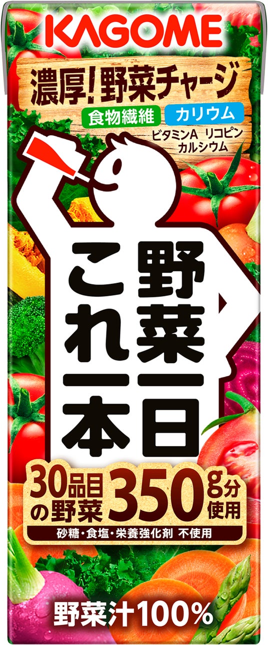 野菜一日これ一本「これ1本」に彩り豊かな30品目の野菜350g分を使用(※1)。砂糖・食塩・栄養強化剤を使用せずに野菜本来のおいしさと栄養(※2)を提供する野菜汁100%ジュースです。トマトの濃厚な味わいを楽しみながら、野菜と栄養(※2)を手軽に補うことができます。※1:野菜飲料は原料野菜の全成分を含むものではありませんが、不足しがちな野菜を補うためにお役立てください。 ※2:食物繊維、カリウム、カルシウム、ビタミンA、リコピン