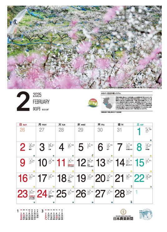 後世に残すべき日本各地の世界農業遺産(GIAHS)。何世紀もわたり、日本の社会や環境に適応しながら日本人によって継承されてきた独自性のある伝統的な農林水産業。またそれに密接に関わって育まれた文化や風景、農業生物多様性などが相互に関連した重要な地域を、国際連合食糧農業機関(FAO)が認定しています。日本に15カ所ある世界農業遺産を、日本農業新聞のカメラマンと、農ジャーナリストの小谷あゆみさんが取材し、2025年版のカレンダーに仕上げました。15カ所の全地域を掲載した、日本農業新聞オリジナルの15カ月カレンダーとなっています。
