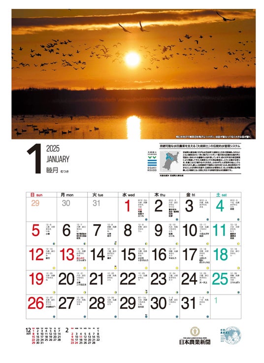 日本農業新聞(東京都台東区)は11月8日、国内にある15カ所の世界農業遺産(GIAHS)を取り上げた「世界農業遺産15ヵ月カレンダー(2025)」を発売します。農ジャーナリストの小谷あゆみさんと本紙カメラマンが取材した連載企画「未来へ続く 農の道」を再構成。26年3月まで使える、本紙オリジナルの壁掛け15カ月カレンダーとなっています。このカレンダーの利益の全額は、能登地域GIAHS推進協議会を通じて能登半島の地震・豪雨被災地の農業復興に寄付します。