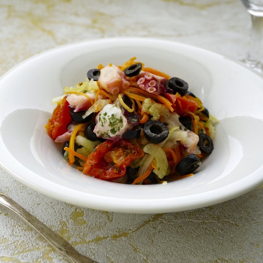 成城石井自家製 タコたっぷり!トマトとセロリのジンジャーマリネ生姜がアクセントのさわやかなセロリマリネに自家製キャロットラペを加え、タコ、チェリートマト、ブラックオリーブをトッピング。