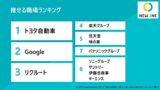 2 推せる職場と聞いて思いつくランキングは、トヨタ自動車、Google、リクルート、楽天グループが上位。
